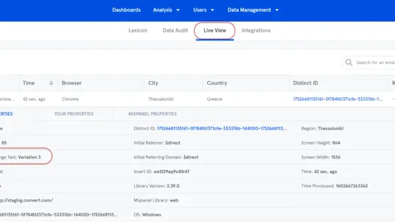 The Convert + Mixpanel integration lets you stream metadata about Convert experiments directly to Mixpanel. Once enabled, each visitor included in a test will have custom Mixpanel properties like Convert – [Experiment Name] with the value set to the variation shown.